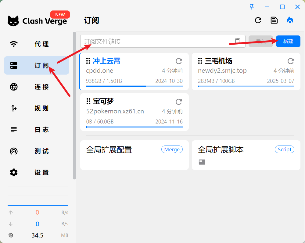 点击左边侧边栏【订阅】输入订阅地址并点击【新建】即可