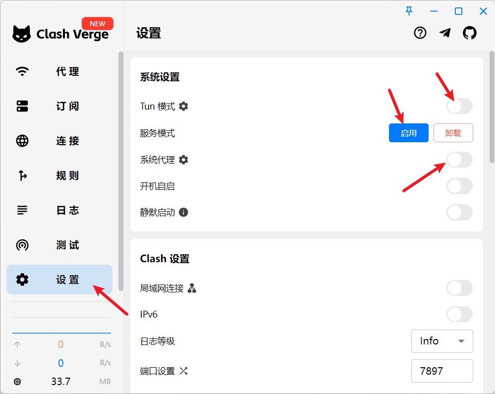 选择左边侧边栏【设置】,开启【Tun模式】、启用【服务模式】、开启【系统代理】即可